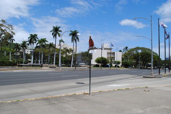 There is no stop sign/sticker. Stops along South Beretania Street (Hawaii State Capitol side). After passing through the Hawaii State Capitol towards the ocean, you will find the statue of Queen Liliuokalani, the 8th monarch of the Kingdom of Hawaii, and further ahead, Iolani Palace, built by the 7th monarch, King Kalakaua.